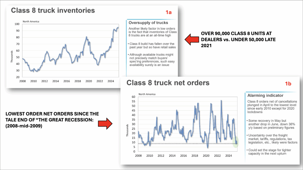 Demand within the trucking sector is showing signs of stabilization, although it remains weak due to ongoing economic uncertainty and policy challenges. According to the report, “LOWEST ORDER NET ORDERS SINCE THE TAIL END OF ‘THE GREAT RECESSION” indicates that Class 8 truck net orders are at their lowest since the economic turmoil of 2008-2009. The subsequent layoffs by every truck OEM due to lack of orders reflect the caution prevailing among large fleets, many of whom are adopting a “wait and see” approach regarding new purchases.